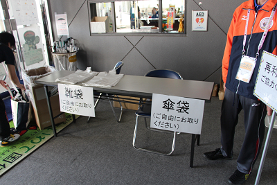 | 靴袋、傘袋を準備して、ここで役員、選手は靴を履き替える |
