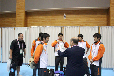 選手、監督、トレーナーを激励する松野木理事長 |