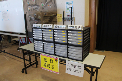 記録速報引き出し。1階と2階の入口近くに置いている。 |