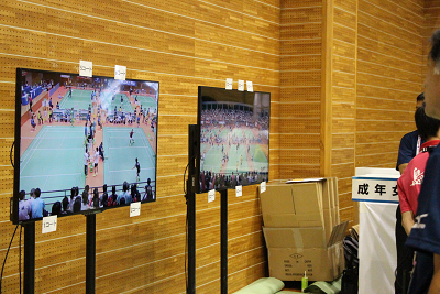 選手集合場所に設置されたモニター。ただし、アリーナ内の全景であって、各コートの詳細をみるのはむづかしい。(前大会の和歌山では、すべてのコートにカメラを取り付けて、ほぼすべての部屋にモニターを置き観戦できた。) |