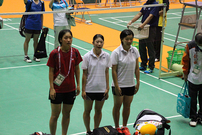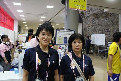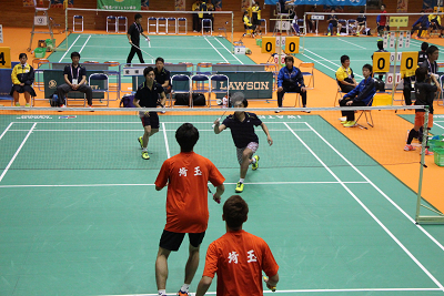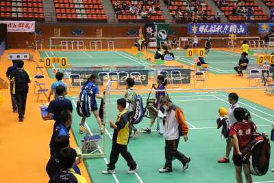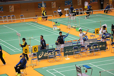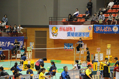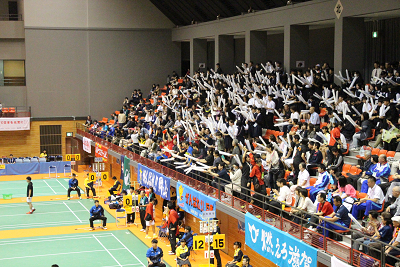 | 『がんばれ愛媛県選手団』という横断幕が掲げられ、その下で西野選手ががんばり21-13,21-12で川端選手(埼玉)を破り、1−1のタイに持ち込む。 |