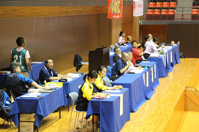 | 本部席。愛媛の少年女子が気になる今大会のレフリー浜中勉。 |